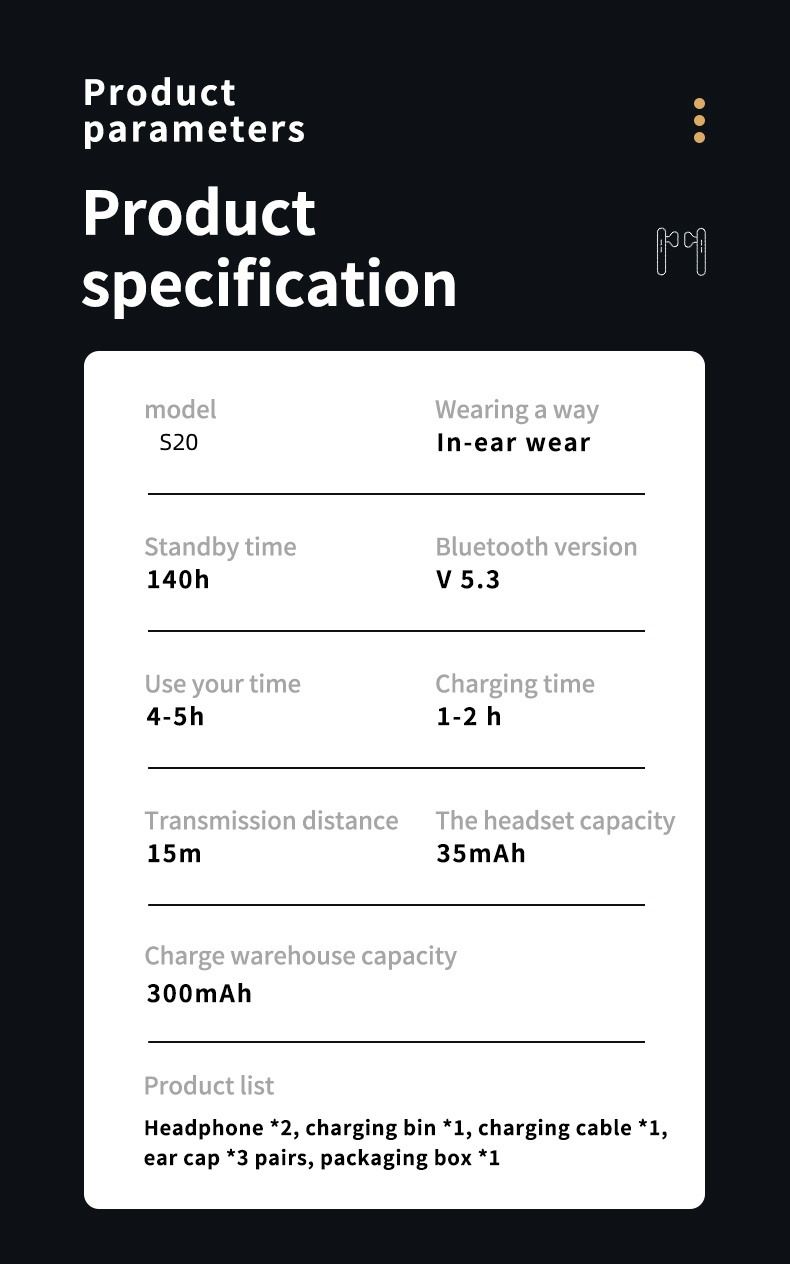 Hot Selling HD Mirror Tws S20 In-ear Wireless BT Earphones Sport Earbud