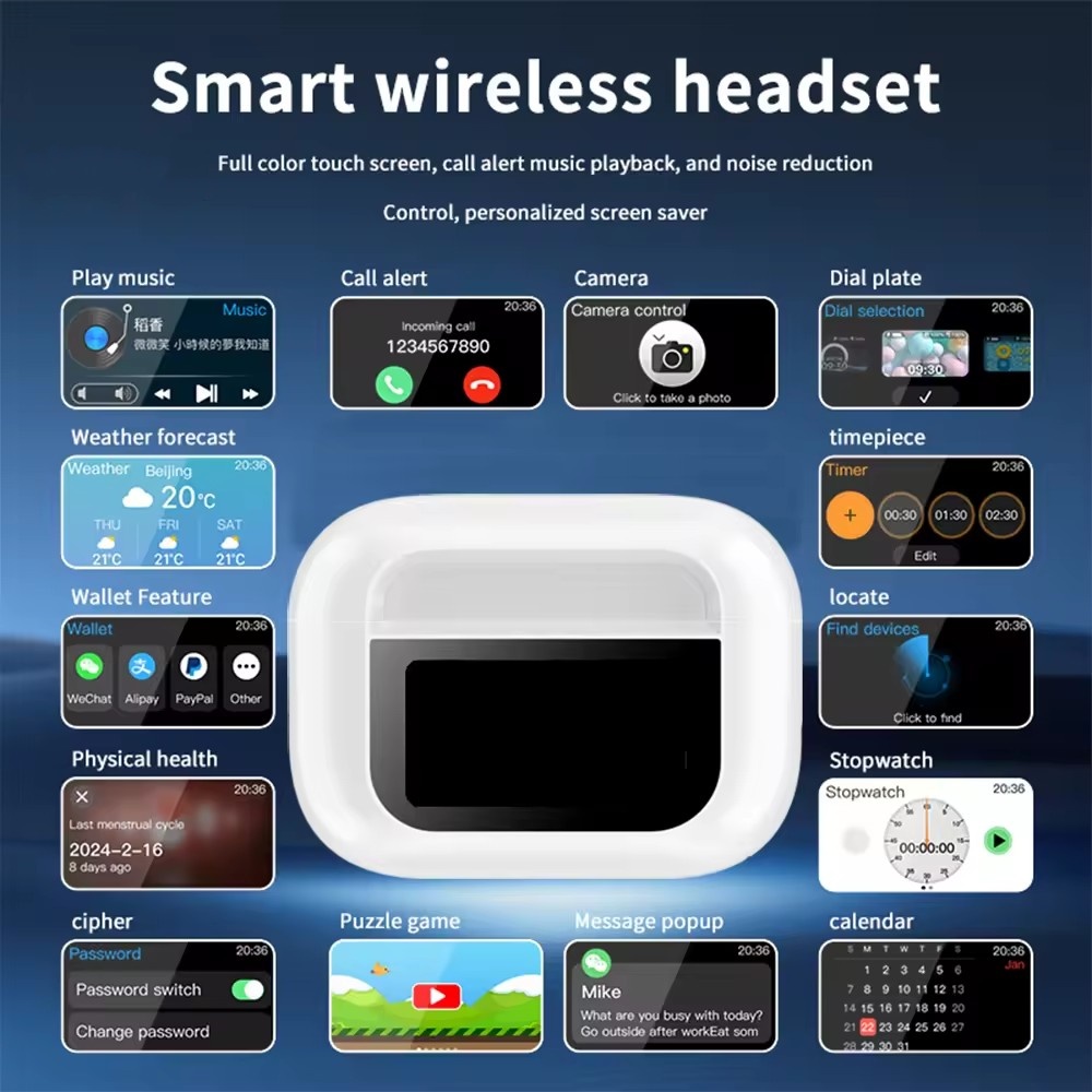 New Hot Sales ANC ENC Wireless Earbuds A8 2 Noise Cancelling LCD Touch Screen Earphone