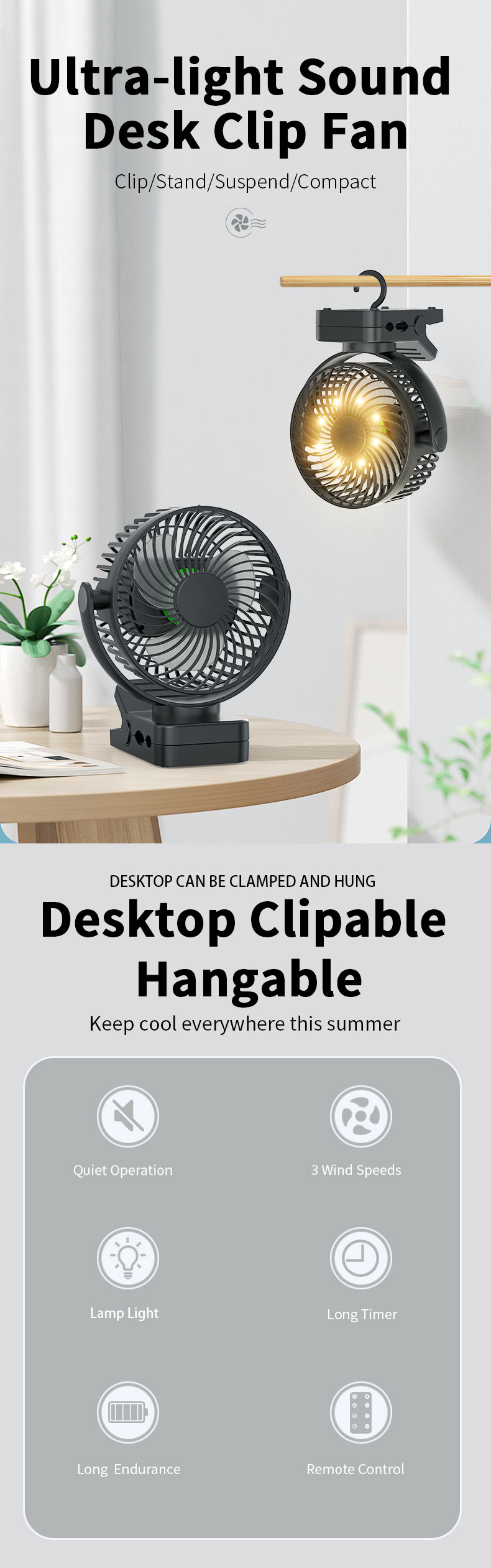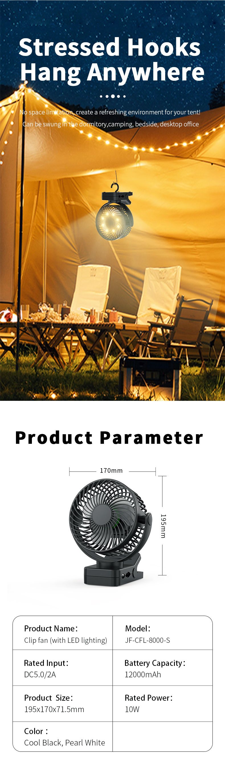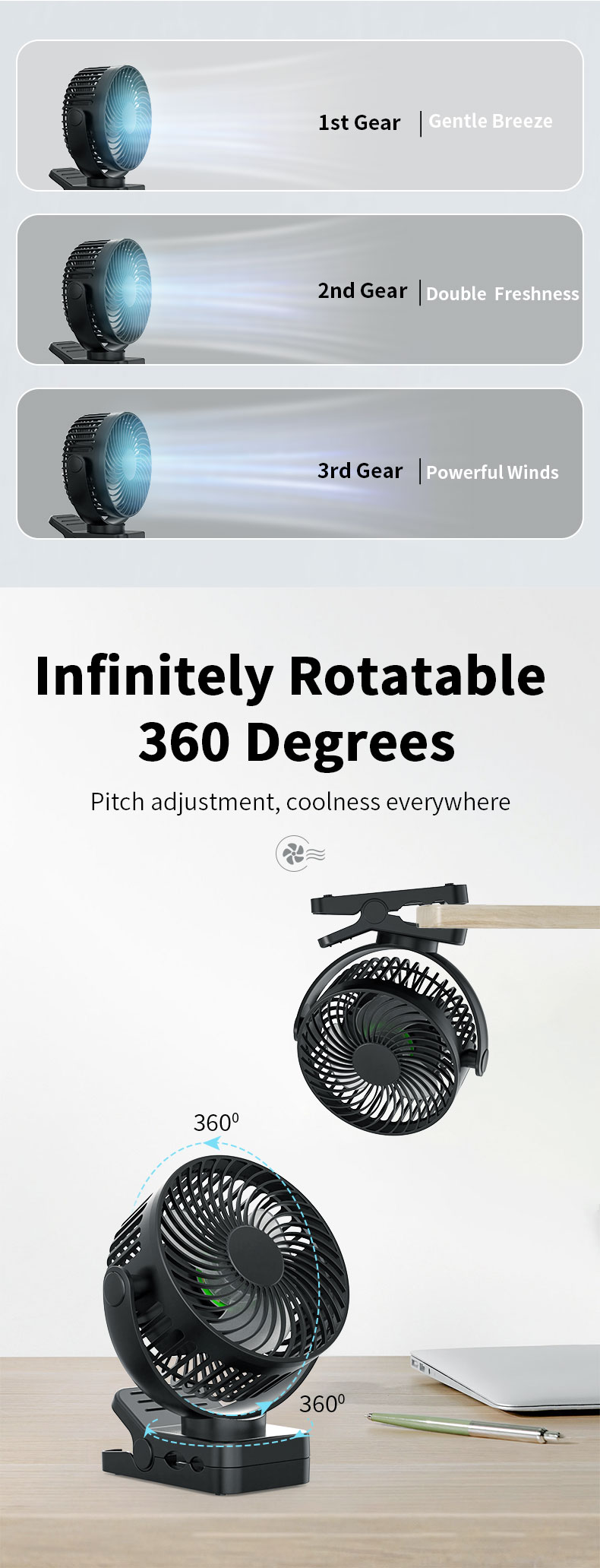 USB Rechargeable Portable Clip Fan With LED Lights for Tent Desk Office